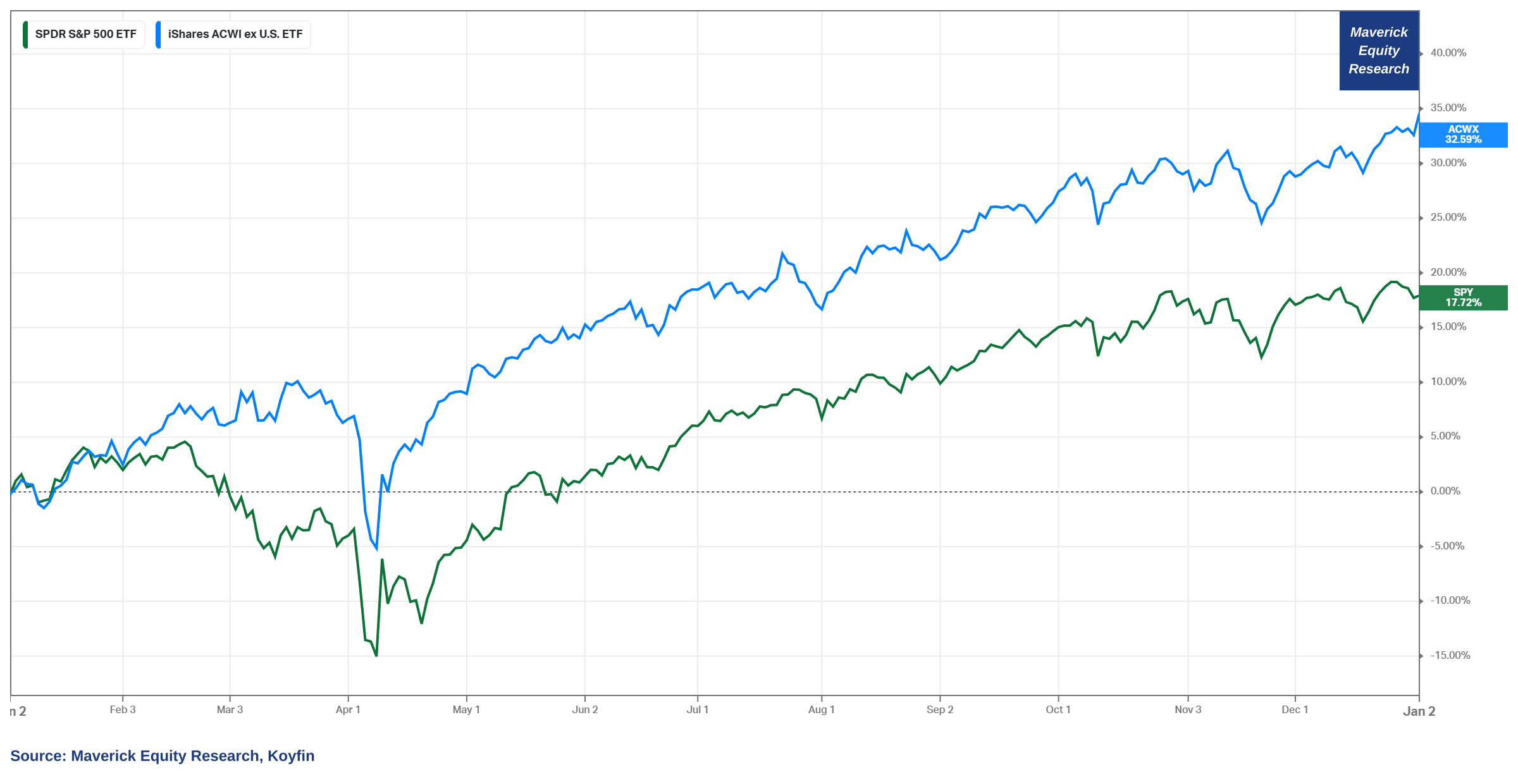 S&P 500 17.72% in 2025 vs ACWI ex-US (ACWX) a whooping 32.59%