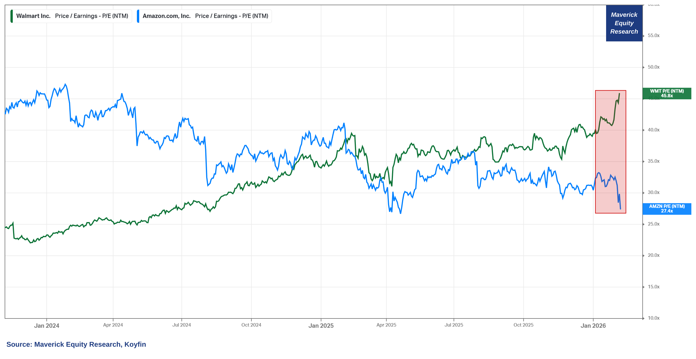 👉 Amazon with a colling 27.4x forward P/E